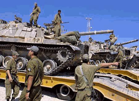 The Israeli army says infantry and armored vehicles have been sent to the West Bank. The mobilization may be a prelude to an invasion of the West Bank, which would essentially be a declaration of war against the Palestinian Authority. The Israeli army deployed military reinforcements Tuesday night in the West Bank in response to another round of mortar rocket attacks against the southern Jerusalem neighborhood of Gilo. Troops and tanks were sent to various parts of the West Bank including around Bethlehem, which is just south of Jerusalem. Officials in the Prime Minister’s Office pointed out that the rocket attacks represented a serious change in the warfare. Israeli soldiers walk around tanks deployed in the West Bank near Hebron, July 18, 2001. Israel said it had bolstered its forces in the West Bank as a warning signal to Palestinian President Yasser Arafat to stop anti-Israeli attacks but an invasion of areas he controls was not imminent SETTING THE STAGE IN THE MIDDLE EAST