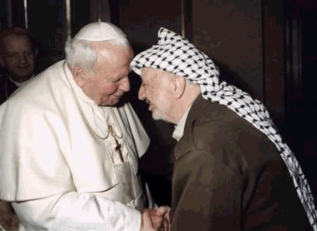 Pressing for international observers in the Middle East, Palestinian leader Yasser Arafat met Thursday with Pope John Paul II at the papal summer retreat at Castello Gandalfo.