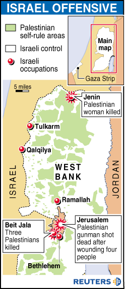 Oct. 22 ….Israel maintained a stranglehold on six Palestinian cities on October 22, 2001 and Lebanese Hizbollah guerrillas stoked Middle East tensions further by attacking Israeli army positions on the Lebanon border. Israel has demanded the Palestinian Authority hand over those involved in Zeevi's killing, that it outlaws groups Israel defines as terrorist and that it arrests militants on a most-wanted list. A Palestinian security official said Israeli authorities had arrested four Palestinians suspected of involvement in killing Zeevi. Secretary of State Colin Powell said he hoped the Israeli army would soon pull out of Palestinian-ruled territory taken since Palestinian gunmen assassinated far-right Israeli cabinet minister Rehavam Zeevi last Wednesday. Prime Minister Ariel Sharon said Sunday Israel's most widespread ground offensive against the Palestinian Authority would end only when it was satisfied Yasser Arafat was cracking down on terrorism.