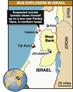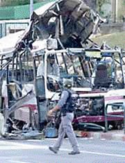Dec. 2….Yet another Palestinian suicide bomb tore through a bus in the northern Israeli city of Haifa on Sunday, killing 15 people just hours after two Palestinian suicide bombers blew themselves up in downtown Jerusalem. The wave of attacks, including a shooting in Gaza have killed 28 people and injured nearly 200 in only 12 hours. Three other Israeli's were killed on Friday in a suicide bus attack in Afula, making 31 unsuspecting innocent Israeli victims through the weekend. The explosion tore the roof off the bus, shattered windows and spread bodies and mangled body parts across a street in a residential neighborhood.
