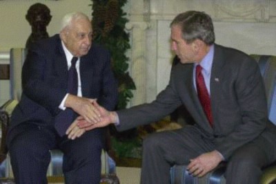President Bush, right, and Israeli Prime Minister Ariel Sharon shake hands during an emergency meeting in the Oval Office of the White House, Sunday, Dec. 2, 2001, in Washington. Bush condemned this weekend's suicide bomber attacks in Israel as "acts of murder" and said Palestinian leader Yasser Arafat must pursue terrorists in his own domain or else. Arafat is a “harborer” of terrorists!