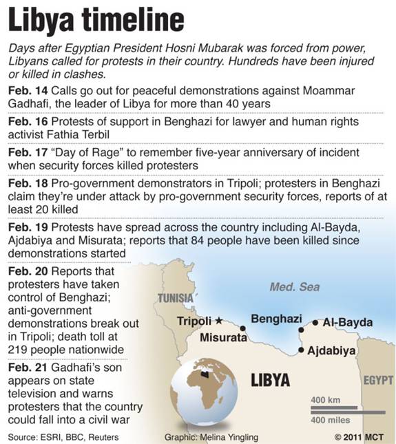 Anti-Gaddafi Rebels Take Over City Closest to TripoliFeb. 28….(Jerusalem Post) Armed men opposed to the rule of Libyan leader Muammar Gaddafi are in control of the city of Zawiyah, about 30 miles west of the capital Tripoli, a Reuters reporter in the town said. The red, green and black flag of Libya's anti-Gaddafi rebellion was flying from a building in the centre of the town and a crowd of several hundred people was chanting "This is our revolution," the reporter said. Also on Sunday, the British government revoked the diplomatic immunity in the UK of Gaddafi and his sons, Foreign Secretary William Hague said, urging Gaddafi to step down. "Of course it is time for Col. Gaddafi to go," Hague said in a BBC interview. "That is the best hope for Libya and last night I signed a directive revoking his diplomatic immunity in the United Kingdom, but also the diplomatic immunity of his sons, his family, his household, so it's very clear where we stand on his status as a head of state," he said. The UN High Commissioner for Refugees (UNHCR) said on Sunday that nearly 100,000 people have fled violence in Libya in the past week, streaming into Tunisia and Egypt in a growing humanitarian crisis.