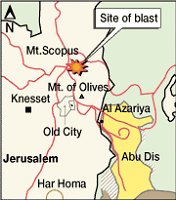 July 31….(Ha Aretz) A bombing in a crowded cafeteria at the Mount Scopus campus of Jerusalem's Hebrew University killed at least seven people Wednesday afternoon and injured at least 85, 14 seriously. The bomb went off at lunchtime in the university's cafeteria. Hamas' military wing, the Izzedine al-Qassam Martyrs' Brigade, said in a statement released to the Arabic satellite television network al-Jazeera that it had placed a bomb in the cafeteria two hours before the explosion. It was packed," Israeli government spokesman Danny Seaman said of the cafeteria. "The place is devastated inside. It's a terrible scene. There are body parts scattered 100 to 200 yards." The attack was at the Mount Scopus campus of the university located near the border between traditionally Arab east Jerusalem and west Jerusalem. "This was one place that I thought was safe," one witness said. It was the second bomb attack in the capital in the space of 24 hours. On Tuesday five people were injured when a suicide bomber blew himself up at a felafel stand in downtown Jerusalem, near the border with the city's largely Arab eastern half.