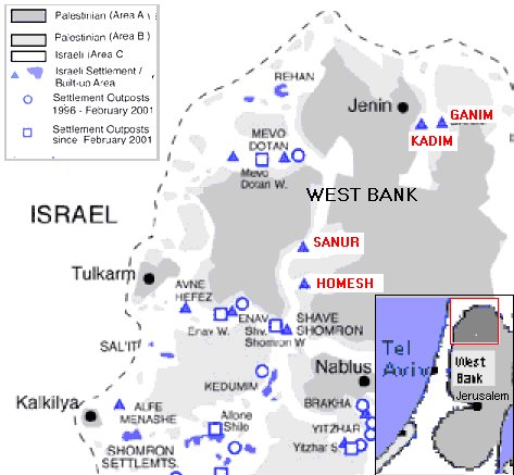FOJ Note: After the Gaza withdrawal phase, Israel will move to withdraw from four Jewish settlements in the Northern West Bank. They include the small towns of Ganim, Kadim, Sanur, and Homesh, which are highlighted on the attached map. These townships were constructed by Israel after the Yom Kippur War.