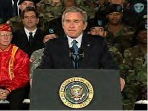 Bush: America is Israel's Shield Nov. 2….(JNEWSWIRE) America must remain resolute in its battle against global Islamic terrorism, or risk serious consequences, including the demise of the Jewish state, US President George W. Bush said in a speech to American troops last week. A perceived US loss in the war on terror would provide the terrorist the means of victory over Israel and eventually the entire Judeo-Christian West, Bush insisted. “With the greater economic, military and political power they seek, the terrorists would be able to advance their stated agenda: to develop weapons of mass destruction, to destroy Israel, to intimidate Europe, to assault the American people, and to blackmail our government into isolation.” The president publicly recognized Israel as an ally against and fellow victim of global Islamic terror, citing Al Qaeda-backed attacks against Israelis in Sinai last year and a recent Hamas “suicide” bombing in the coastal town of Netanya. Leftist liberal voices in America have accused the Bush Administration of going to war against Iraq at the behest of Israel and the Jews and in order to protect Jerusalem from further aggression from Saddam Hussein. Those same voices are insisting the president end his efforts to eradicate Islamic terrorism.