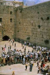 When Rome destroyed the second temple in 70 C.E., only one outer wall remained standing. The Romans probably would have destroyed that wall as well, but it must have seemed too insignificant to them since it was not even part of the Temple itself, but just an outer wall surrounding the Temple Mount. For the Jews, however, this remnant of wall of what once was the most sacred building in the Jewish world quickly became the holiest spot in Jewish life. Throughout the centuries Jews from throughout the world made the difficult pilgrimage to Palestine, and immediately headed for the Kotel ha-Ma'aravi (the Western Wall) to pray to God. The prayers offered at the Kotel were so heartfelt that Gentiles began calling the site the "Wailing Wall." The name has stuck ever since. Orthodox Jews pray three times a day at the wall for the Temple's restoration, and Jews for centuries have come to the wall to lament the loss of Jerusalem and the Temple.